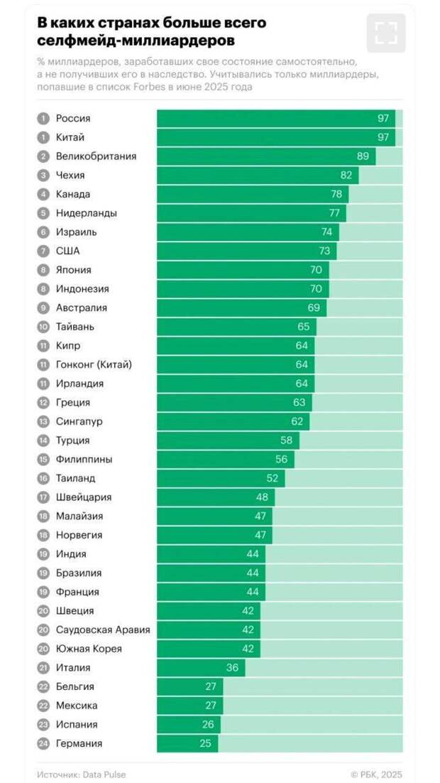 Россия стала мировым лидером по числу миллиардеров, которые заработали состояние самостоятельно, а не получили его в наследство.
