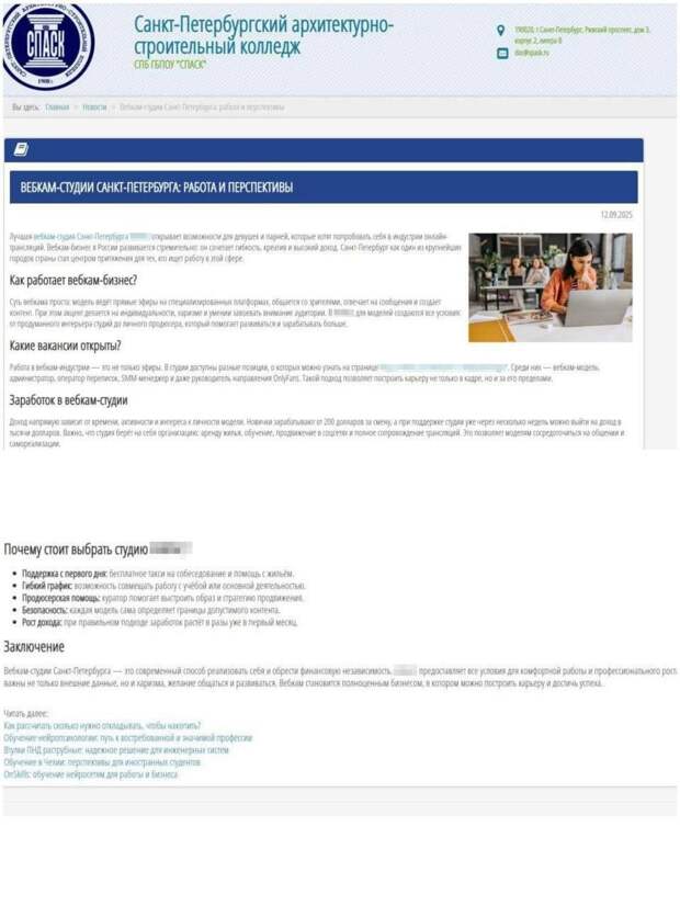 Строительный колледж в Питере предложил студентам пойти в вебкам. На сайте появилось объявление с обещаниями комфортных условий, гибкого графика, бесплатного такси на собеседование и помощи с жильём. В тексте подчёркивается, что вебкам-бизнес в России быстро развивается. Сейчас сайт колледжа перестал работать https://t.me/webmoney_dn/304387